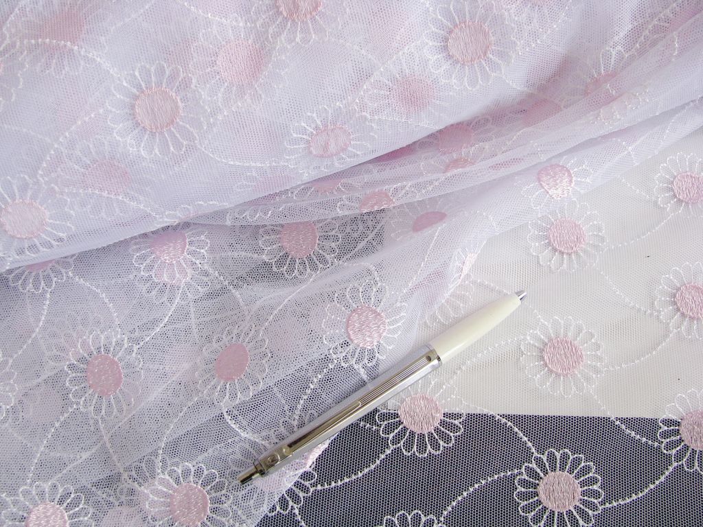 10m besticktzer Tüll, 25%, in weiß, bestickt mit zarten Blümchen in weiß und rosa,