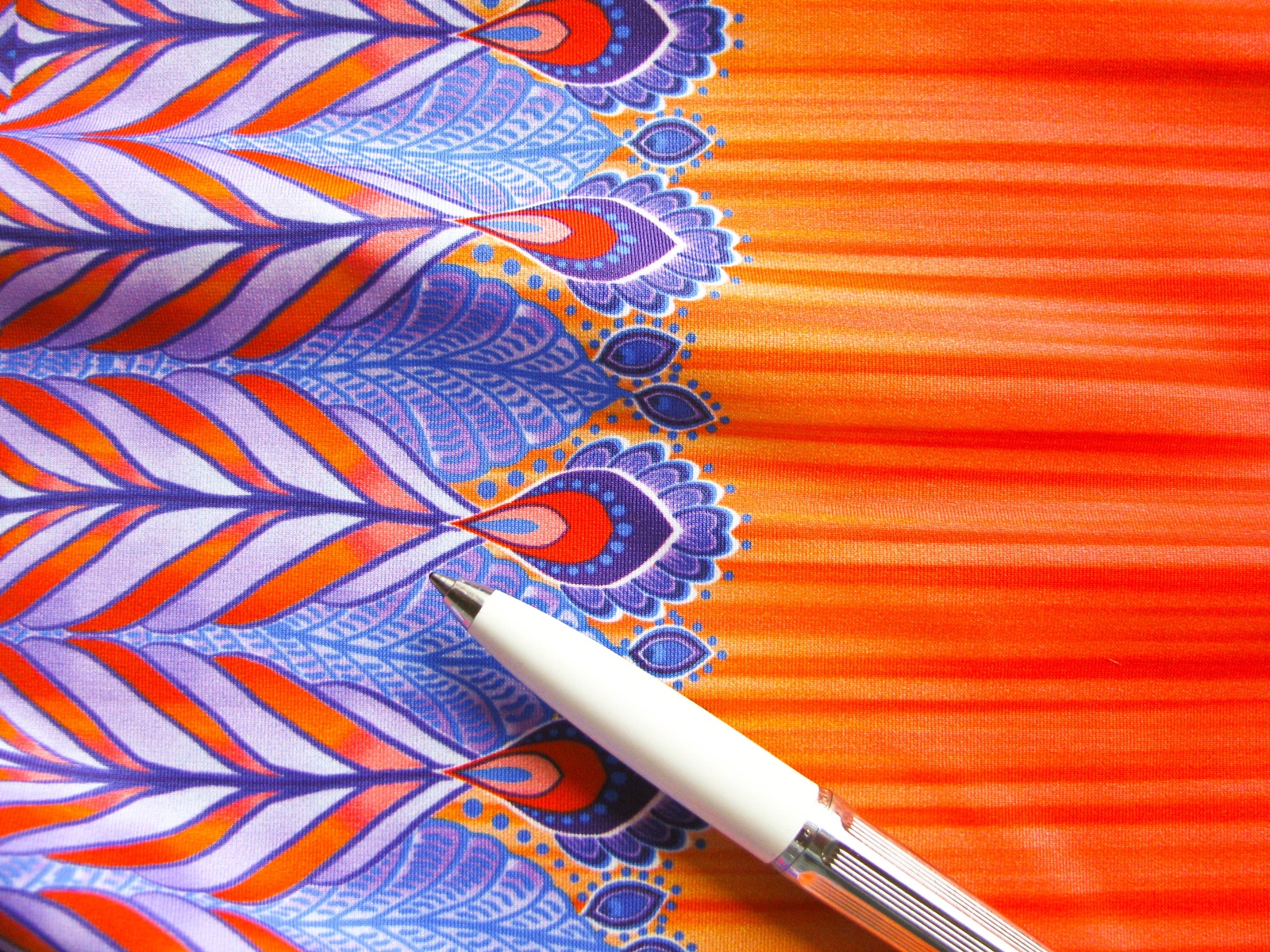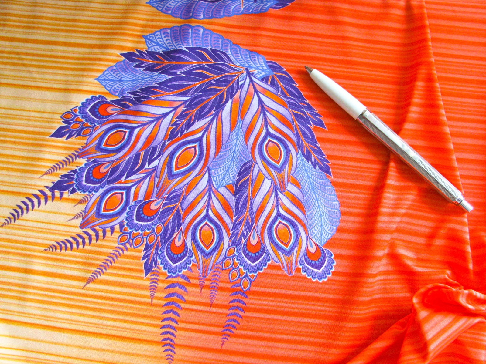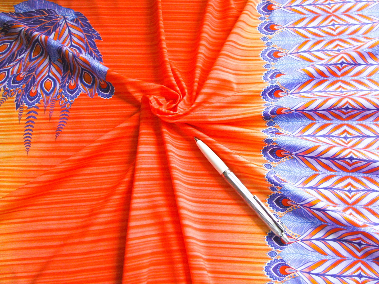 1m bi-elastische Microfaser "Peacock fields" in rot/orange Tönen mit Pfauenfelder... lt. Foto