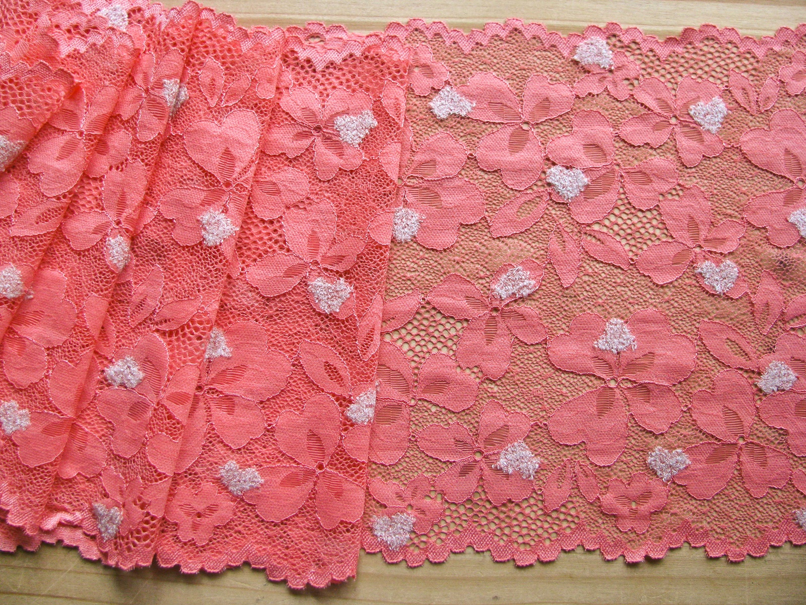 1m elastische XL-Spitze "Teddy-Heart" in koralle, mit "flauschigen" Herz-Einwebungen in weiß