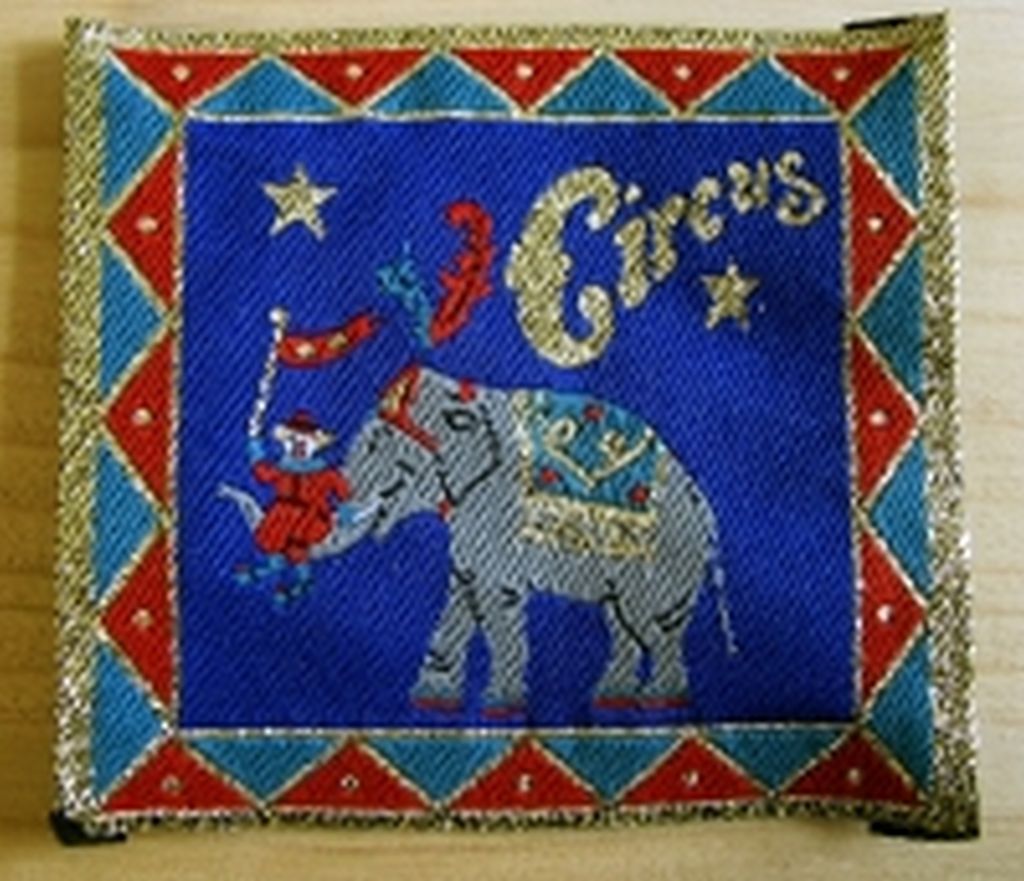 1 Stk Aufnäher "Zirkus Elefant-"  in gold, blau, rot und grün, gewebt ,